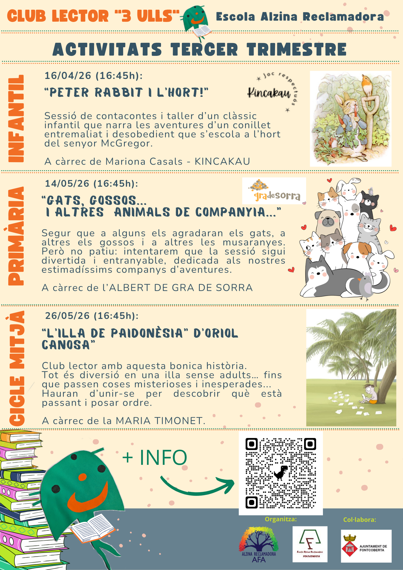 Com que s’ho passa tan bé vol compartir-ho amb tots els infants de l’escola Alzina Reclamadora, és per això que cada any organitza sessions adaptades per cada cicle i ens porta contes a les aules de l’escola!